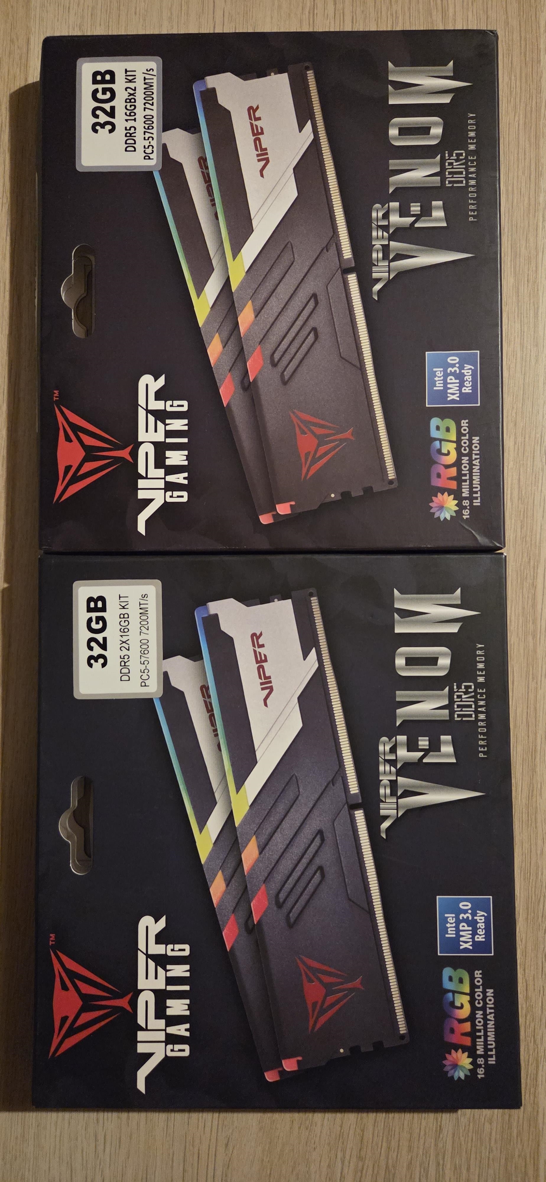 Patriot Viper Venom 2 kit de 32go 7200mhz soit 64go pour les deux kit possible de les vendres séparément, elles étaient utilisées avec un i7 14700k dans une tour filmmaker passage en 128go. Ref : Patriot Viper Venom 32 Go Kit DDR5-7200 CL34 (PVV532G720C34K) 210€ in