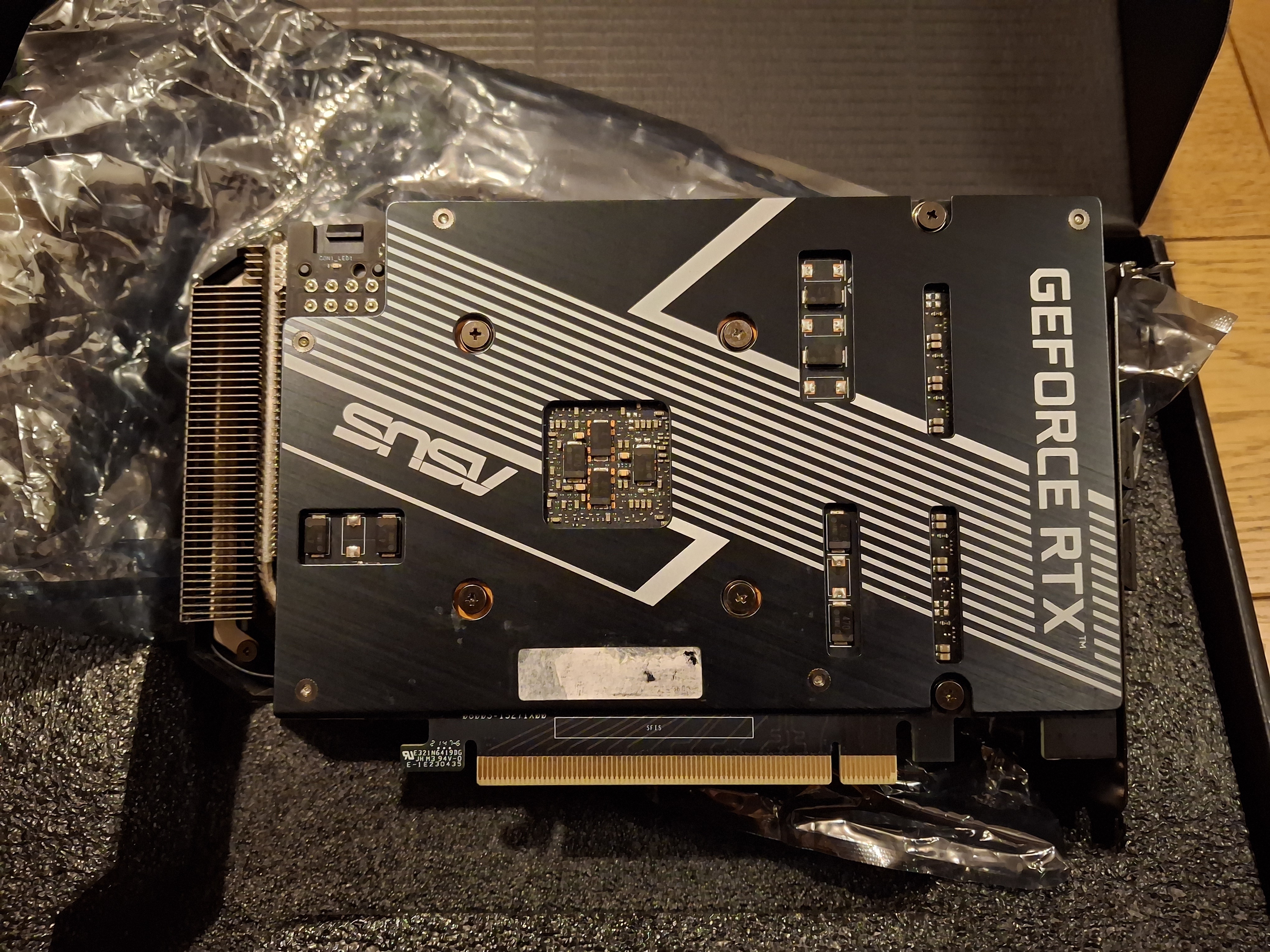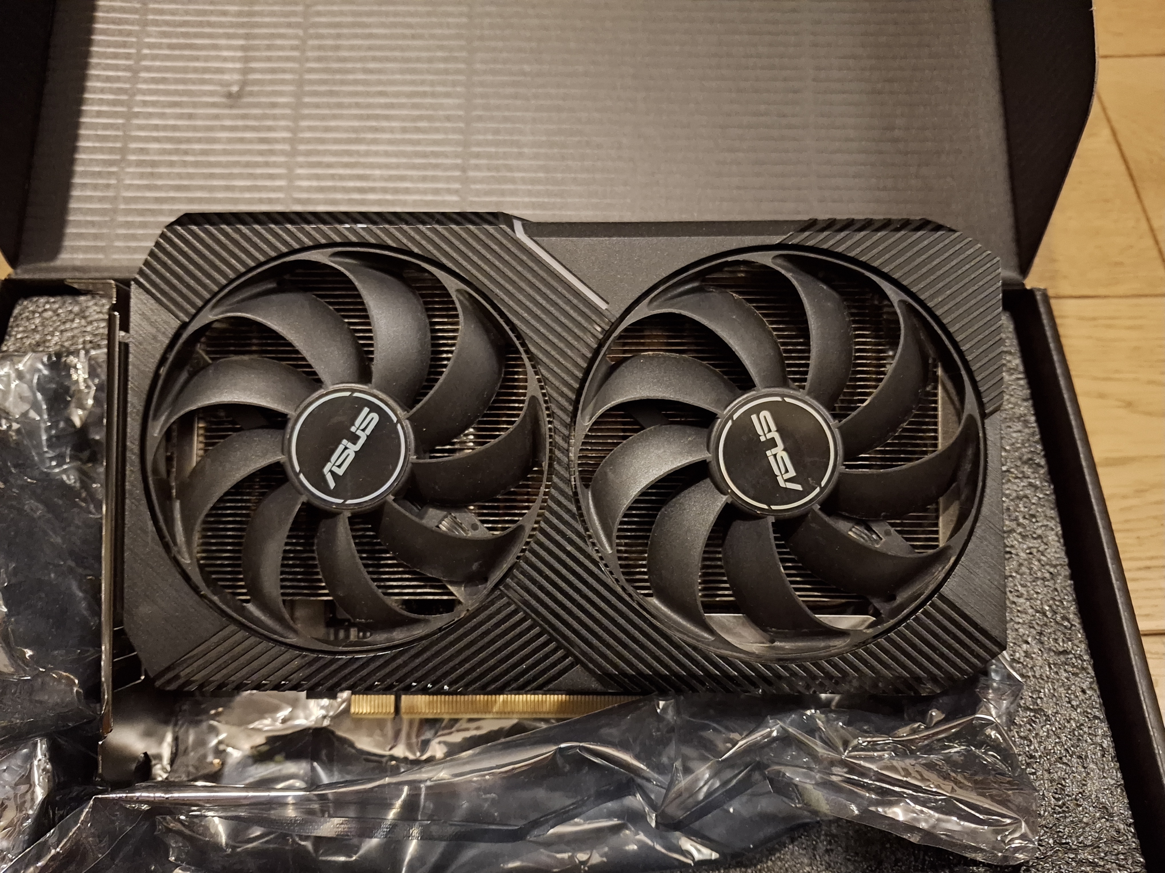 -Une Asus RTX 4060 Dual OC. Achetée sur PC Componentes il y a un an (décembre 2024). Pas de minage, que du casual gaming, parfait état, sauf une petite déchirure en bas à gauche de la boîte externe (j'avais voulu déballer trop vite