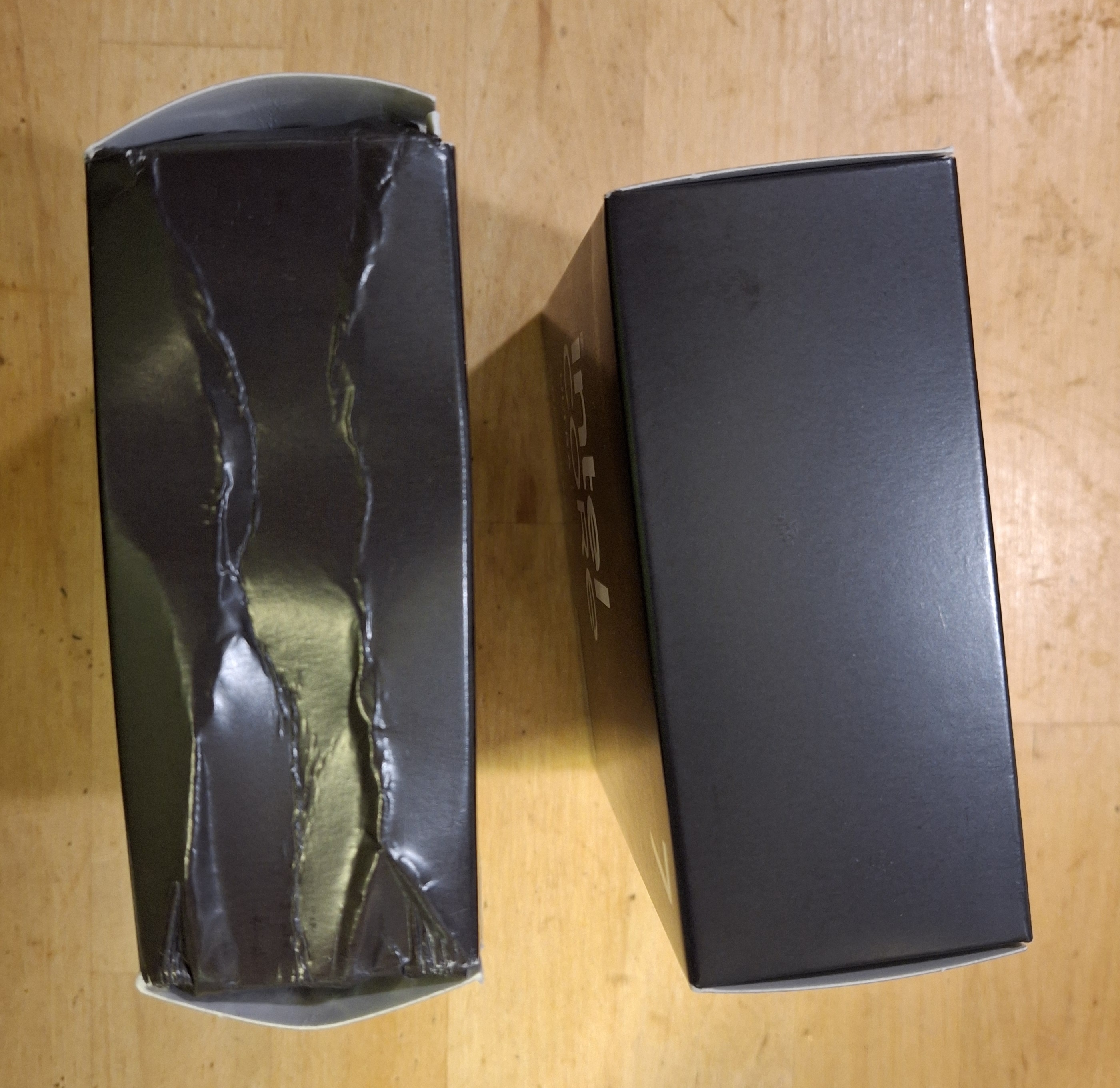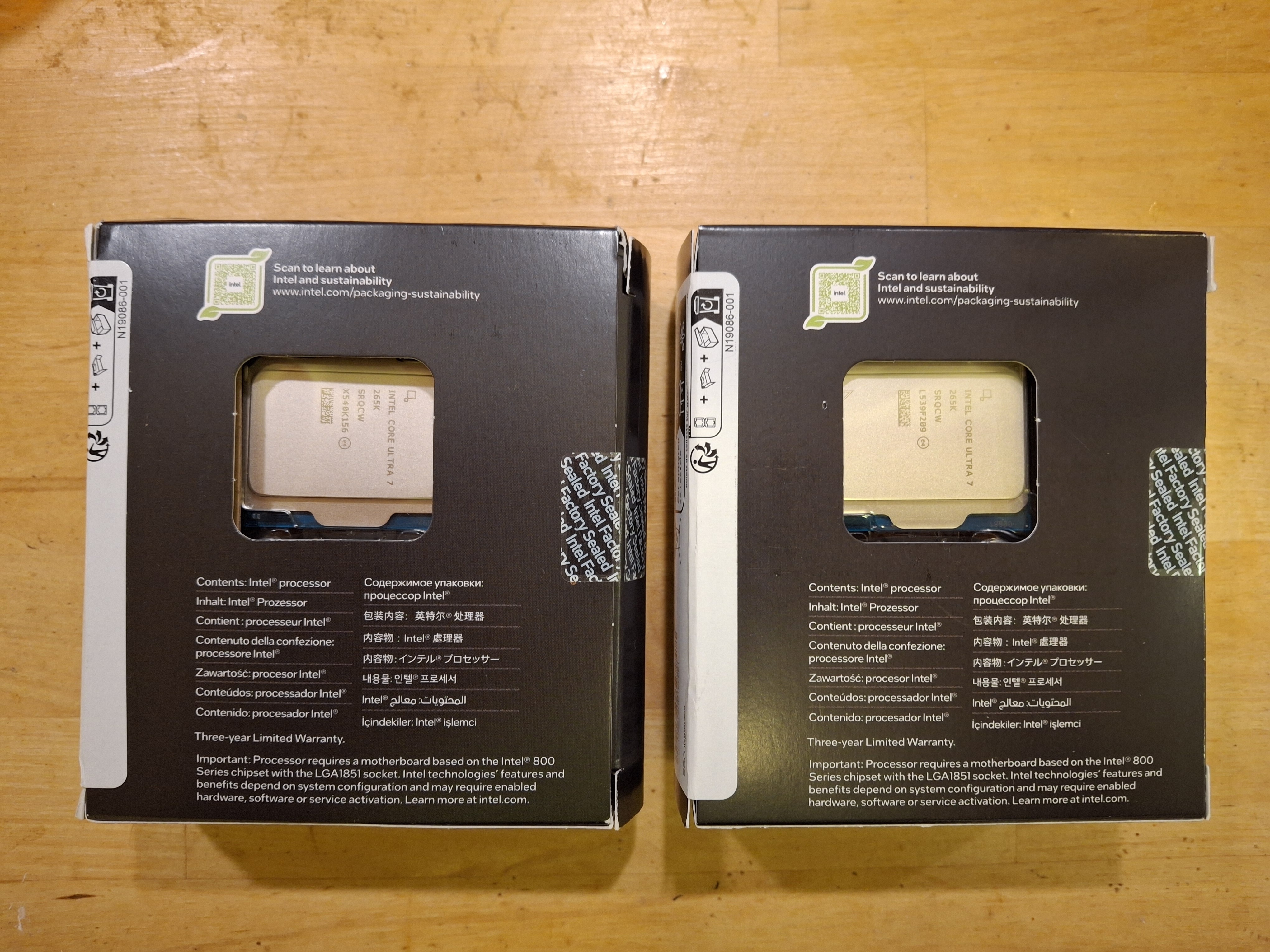 - un Core Ultra 7 265K Acheté 240 € le 25 novembre sur Amazon.de, la boîte était aplatie quand il est arrivé, ils l'avaient envoyé dans une grosse enveloppe cartonnée. J'ai à peine eu le temps de contacter le service client et leur envoyer une photo qu'ils m'en ont renvoyé un en me disant de garder celui à la boîte abîmée. Ci-dessous, les photos des deux CPUs :