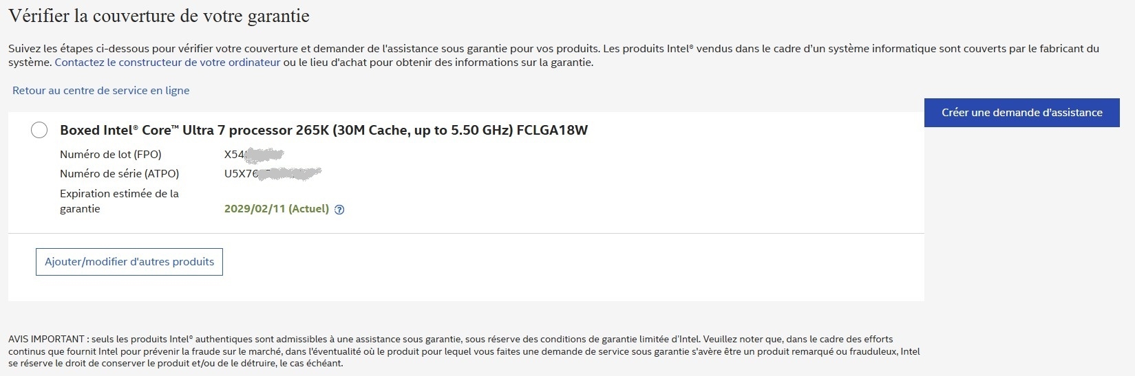 J'ai juste ouvert la boîte pour voir s'il n'y avait pas de traces de cet "aplatissement", RAS sur le packaging intérieur Et j'ai vérifié au passage la garantie sur le site Intel :