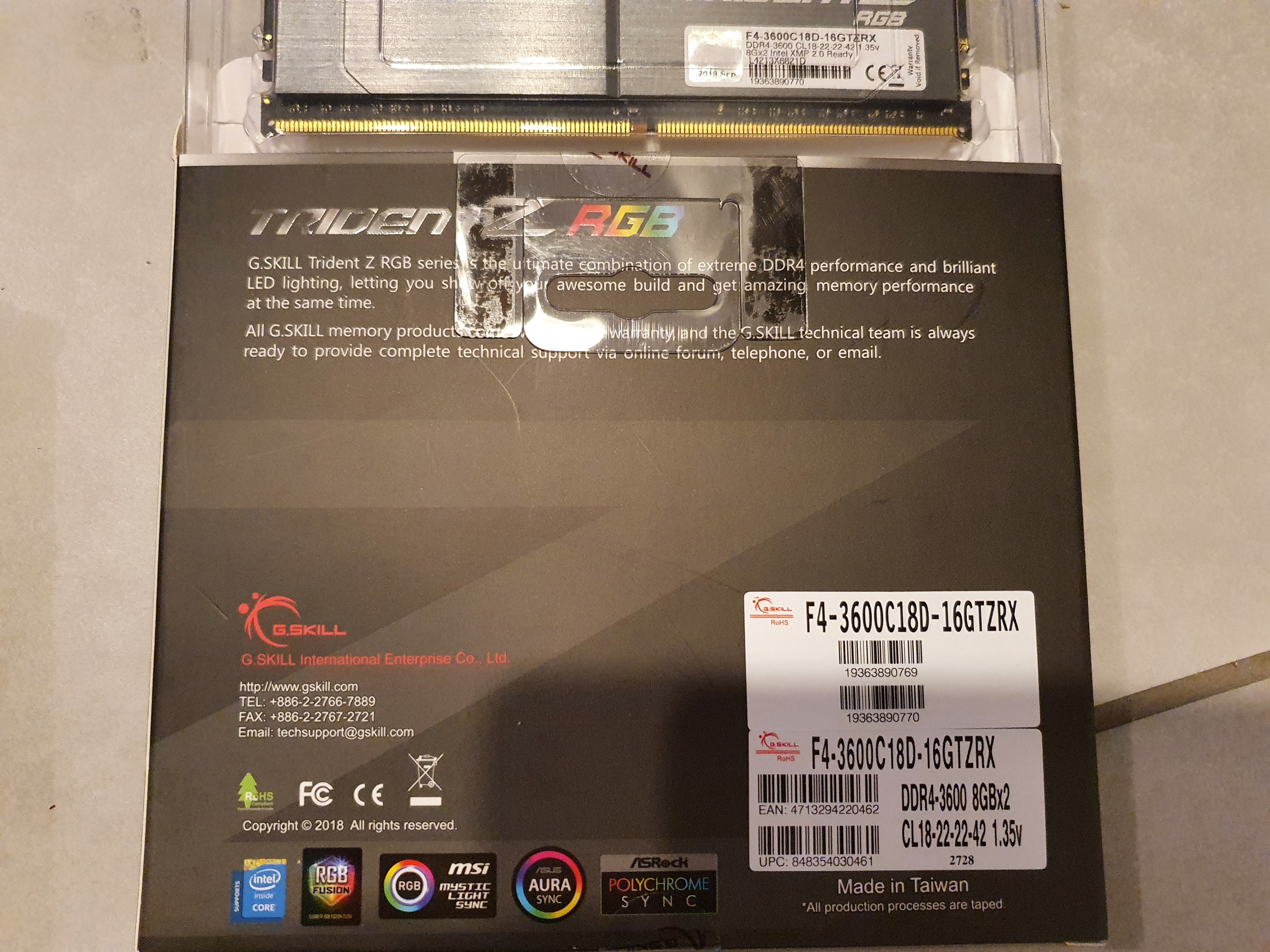 16Go RAM G.Skill Trident Z RGB (2x8) DDR4 3600 MHz CL18 (boite + facture) 90€
