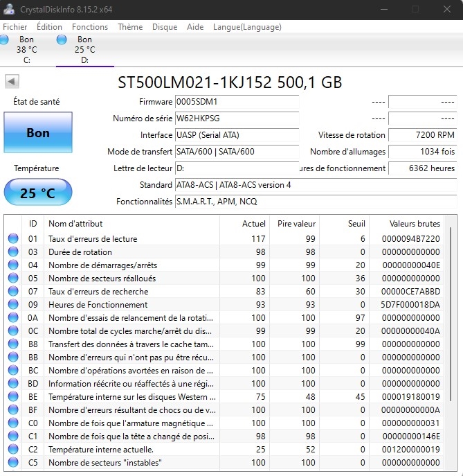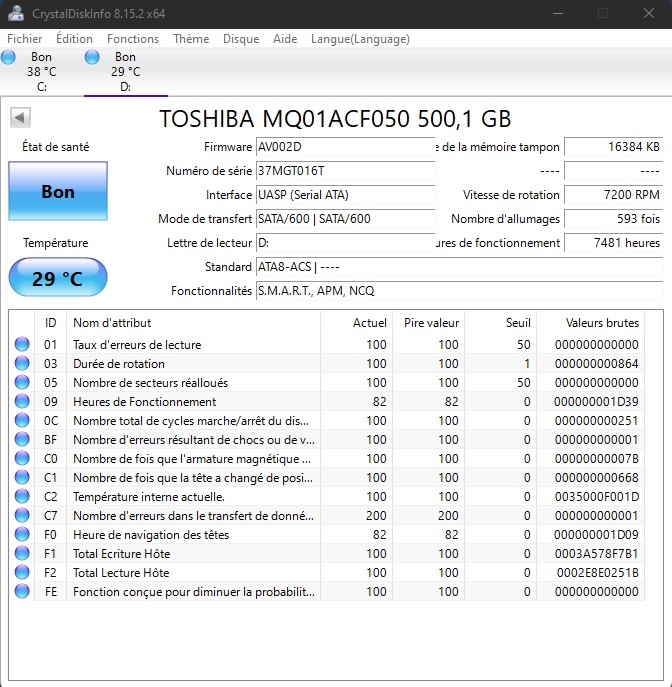 Exemples de Crystaldiskinfo (ils sont à peu près tous équivalents) :