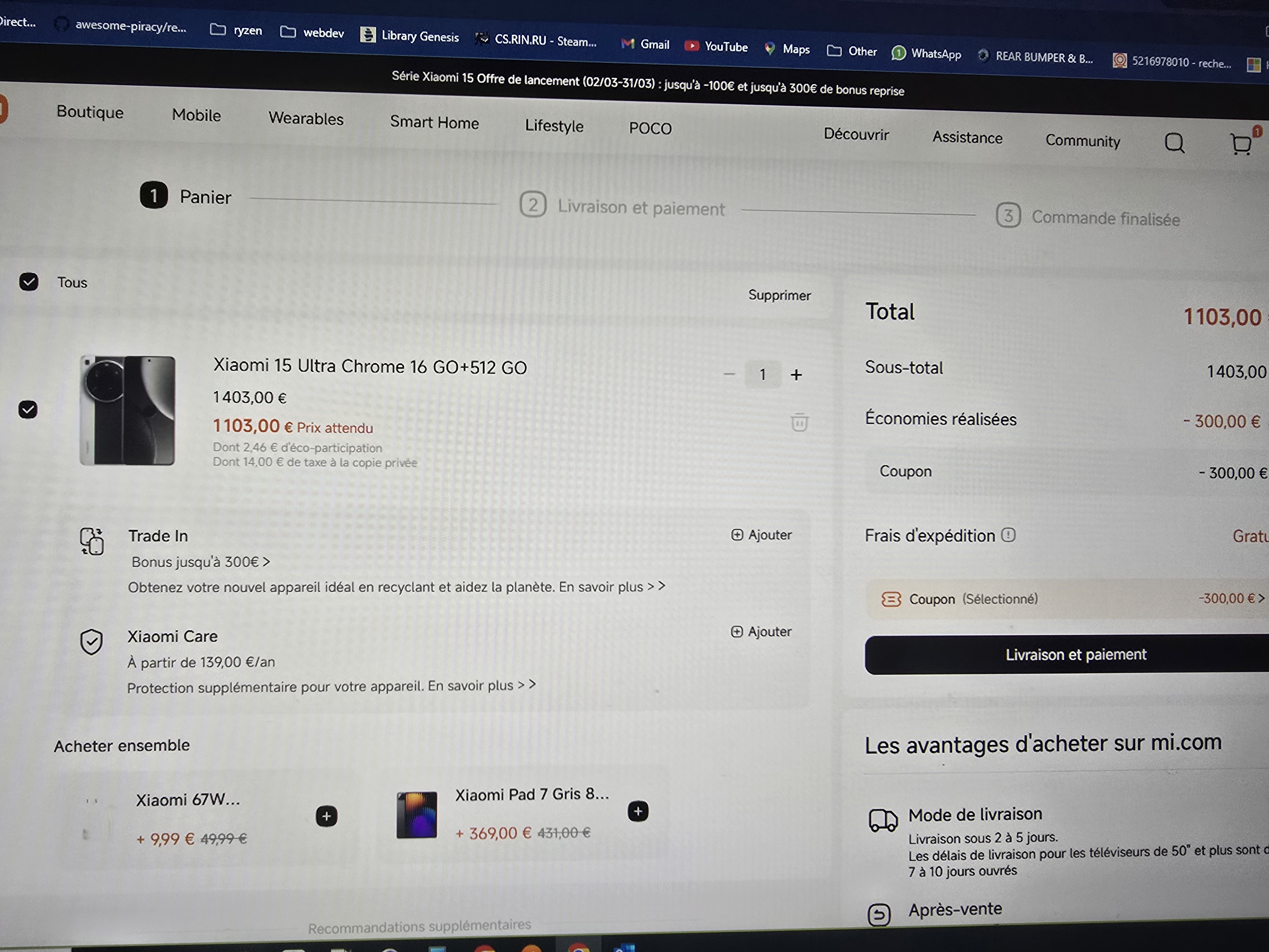 Salut, je sais pas si je dois me lancer dans cette affaire, mais bon. Je partage l'information on verra si on peut faire quelque chose. Perso j'ai hésité change mon s24 ultra pour le 15 ultra, mais je viens de charger toute ma config pc avec des pièces d'ici et j'ai beaucoup dépensé de coup le téléphone sa sera l'année prochaine. Ça se trouve j'ai un code ancien client (300 euros) et c'est dommage qu'il va expire sans être utilisé. Le téléphone revient à 1103 euros. Si tu veux tu me fais un virement et je le fait livrer chez toi directement. Par contre la facture sera à mon nom je ne pense pas que on peut changer cela. Mais je vais te faire une lettre de session pour la garantie. Maintenant la question pourquoi je fais ça ? Bah, encore une fois dommage que ce code sera pas utilisé et au passage je vais ramasser aussi les points de fidélité grâce à cette achat. Voilà t'en pense qoui ?