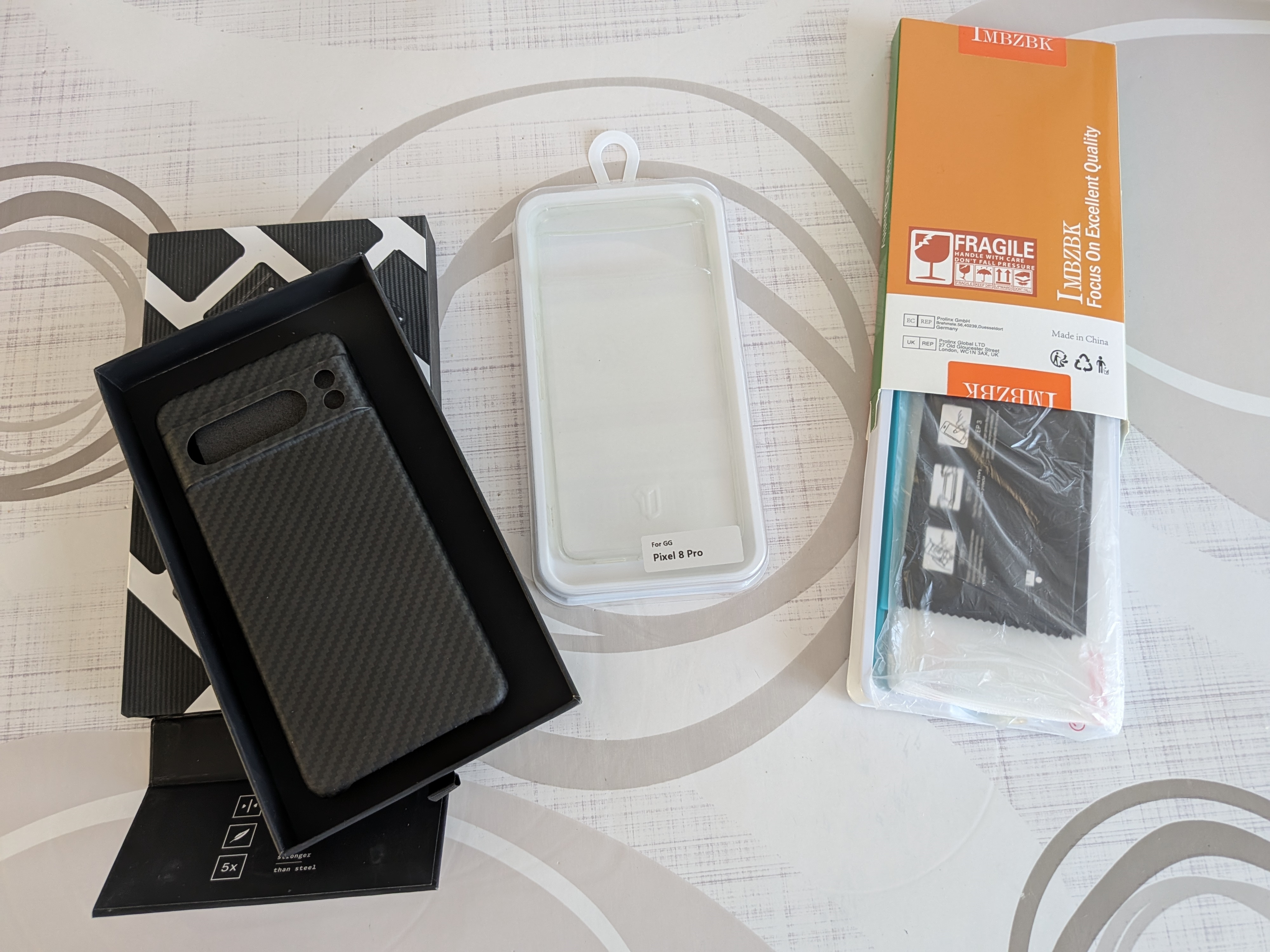 Je vends un lot d'accessoires pour Pixel 8 pro: Coque Noname silicone transparente Coque latercase en Kevlar ultra fine (0,6mm) 3 protections écran + une protection APN