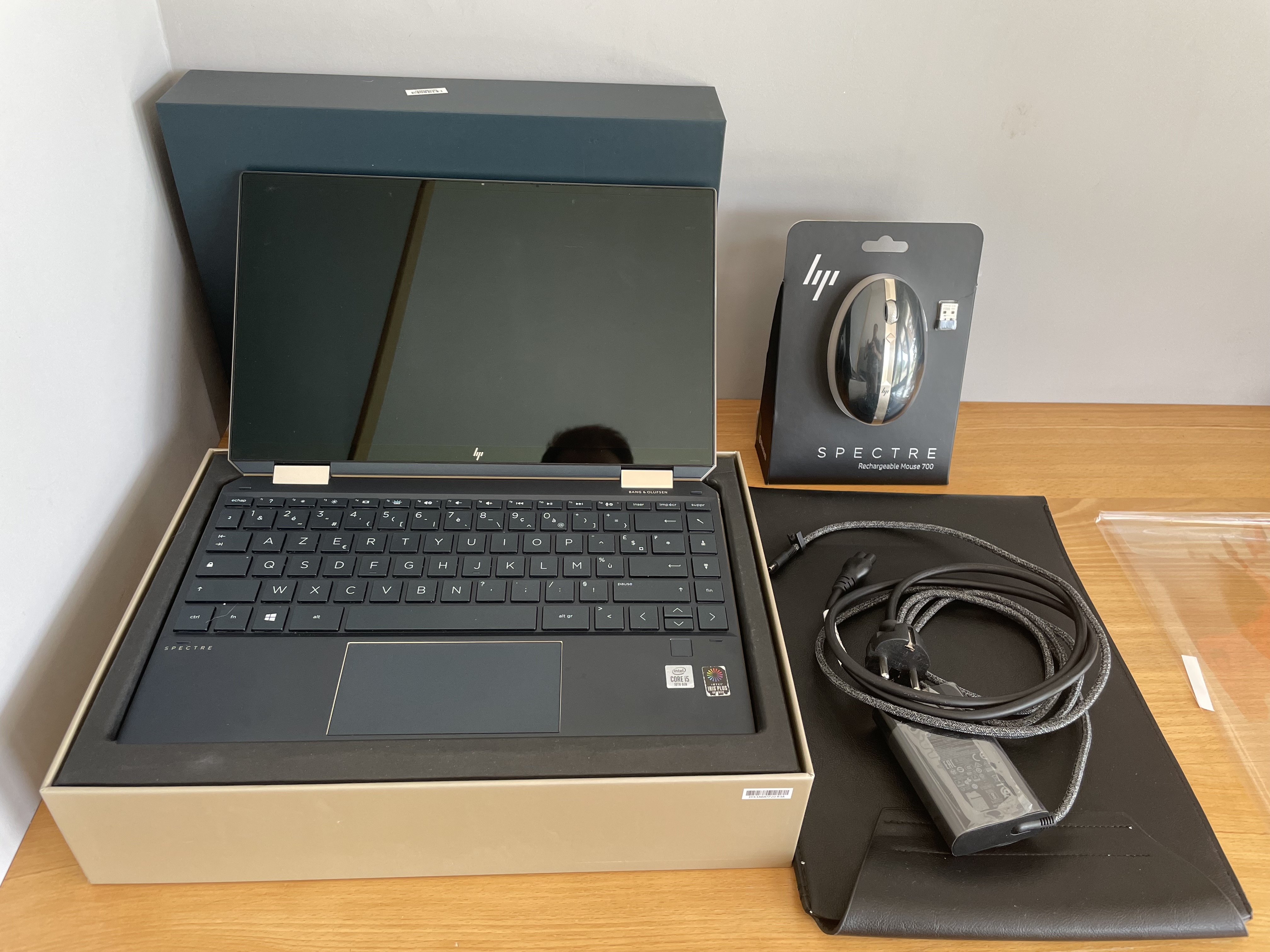 Sera livré dans sa boite et avec tous ces accessoires d'origine (Housse, Chargeur) ainsi qu'une souris sans fil de la même couleur que le PC portable (bleu Poséidon et or) donnée en cadeau.