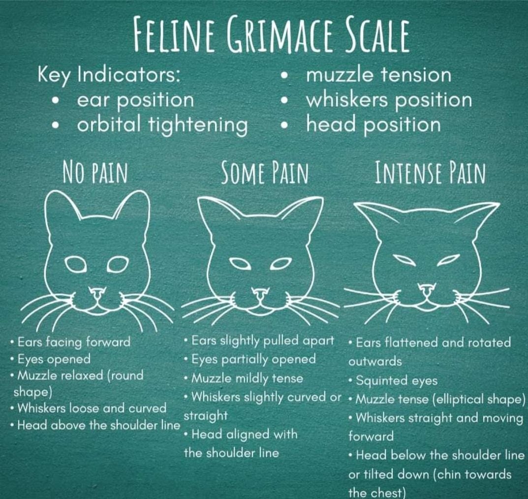 Un chat qui souffre est très discret et il ne miaule pas forcément pour exprimer sa souffrance, sa tolérance à la douleur est beaucoup plus grande que chez un humain. S'il se met à hurler, c'est que c'est extrêmement grave. Les signes d'une souffrance peuvent être :