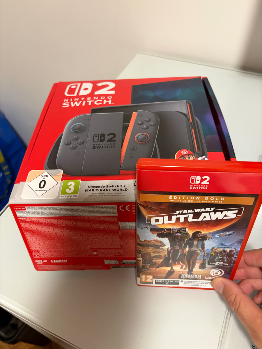 Bonjour. Je vends une switch 2 pack mario kart Achat Fnac 21/11. Facture à mon nom. Jeu mario kart non utiliser Vitre poser day one. 420€ Jeux switch 2 Star Wars Outlaws 20€ Vendu à Miao Jex Livraison ok. RMP Bordeaux.