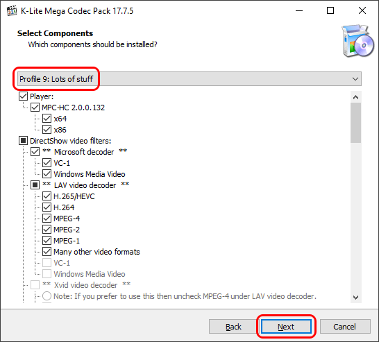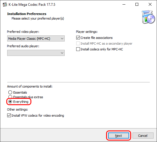 Le logiciel est un pack de codecs, il vous suggère éventuellement de l'associer à un autre lecteur qui serait déjà présent dans votre système comme VLC éventuellement, mais je vous déconseille de changer cela. Je vous conseille plutôt d'utiliser le lecteur recommandé est fourni dans le pack, le lecteur Media Player Classic évidemment. Pensez également à cochez la case " Everything " pour installer la totalité des composants du pack. Cliquez sur " Next "