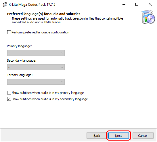 C'est une fonctionnalité que je n'utilise jamais mais qui peut avoir une utilité pour certains. Par exemple si vous êtes un grand amateur de VO sous-titré, lorsque vous avez un MKV en mutilangues par exemple vous pouvez ordonner au lecteur de charger en priorité l'anglais au lieu de la langue choisie par défaut par l'encodeur du fichier MKV. Moi personnellement je n'utilise pas cela, je m'en remets au choix de l'encodeur qui privilégie le plus souvent la langue française évidemment. Après c'est là aussi une question de préférences. Cliquez sur " Next "