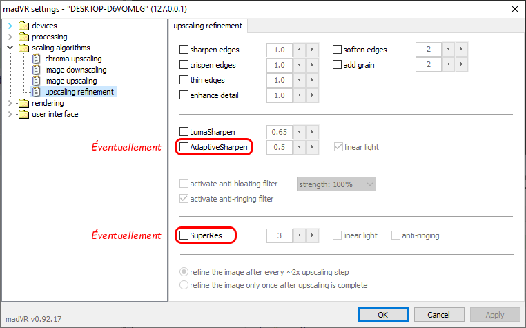J'ai activé sur ma config (HTPC sous Médiaportal) les options "Adaptive Sharpen" et "SuperRes" pour la catégorie 60p. Je n'ai pas noté de différence visuelle immédiate mais mes tests ont tourné court car l'image laguait fortement (tests sur de la TV HD TNT).
