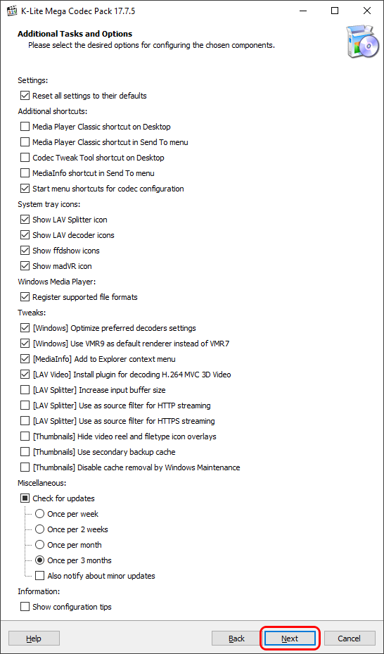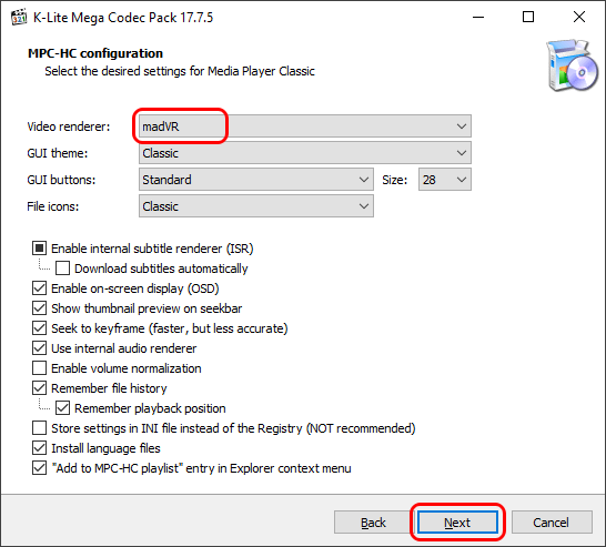 Là il y a une option qu'il ne faut pas manquer. Il faut sélectionner le moteur de rendu vidéo par défaut, c'est là qu'il faut sélectionner le moteur de rendu MadVR qui nous intéresse ici. Sur cette page de réglages il faut éventuellement s'assurer aussi que les langues additionnelles ont bien été cochées par défaut si vous voulez avoir le lecteur Media Player Classic en français. Personnellement j'aime bien activer aussi le On-Screen-Display, abrégé en OSD, cela permet d'afficher les infos à l'écran notamment les timecodes lorsque vous faites une avance rapide par exemple dans une vidéo. C'est à personnaliser selon vos préférences après. Cliquez sur " Next "