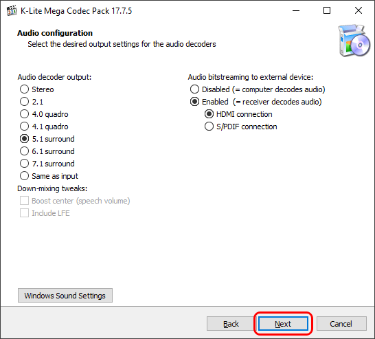 Oui, ce cas de figure est abordé dans le tutoriel. Il n'y a pas de soucis tu peux obtenir du 5.1 avec ton ancien ampli en S/PDIF. Par contre comme c'est un ampli ancien il est préférable de faire le décodage du son en amont sur ton PC plutôt que dans l'ampli parce qu'il se pourrait que ton ampli soit un jour confronté à un format moderne qu'il ne connait pas. Le logiciel lui en revanche il connait tous les formats audio, même les plus modernes. Laisse donc plutôt le logiciel procéder au décodage du son, ce sera LAV Audio l'outil de décodage intégré dans le K-Lite Mega Codec Pack qui procèdera au décodage du son. Éventuellement refais l'installation du pack pour sélectionner la bonne configuration. Et à cette étape, tu sélectionneras ces options comme sur l'image # Audio decoder output : 5.1 surround # Audio bistreaming to external device : Disabled (=computer decodes audio) # S/PDIF connection