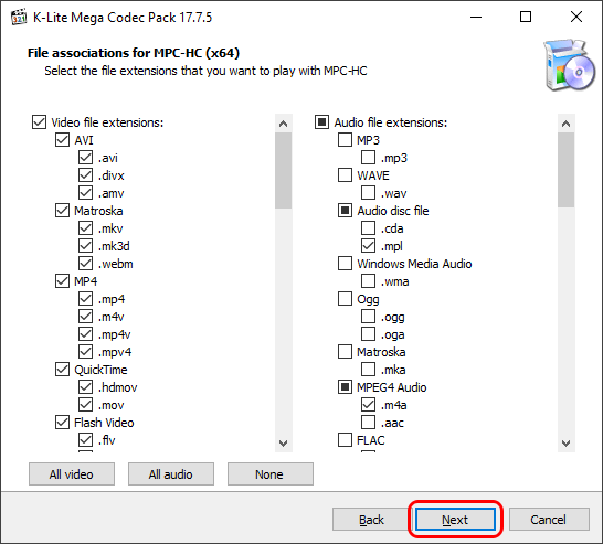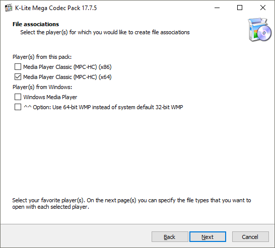 Une petite fenêtre qui en précède une autre où vous allez choisir les extensions de fichiers à associer avec votre lecteur. Ici vous pouvez directement cliquer sur " Next "
