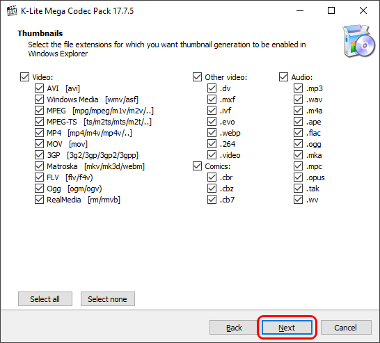 Dans cette fenêtre vous allez pouvoir choisir quels fichiers doivent afficher des miniatures de vidéo dans votre explorateur Windows, vous pouvez éventuellement exclure des extensions de fichiers si c'est important pour vous. Personnellement je laisse toutes les miniatures se générer dans l'explorateur Windows, c'est à dire je garde le réglage proposé par défaut. Cliquez ensuite sur " Next "