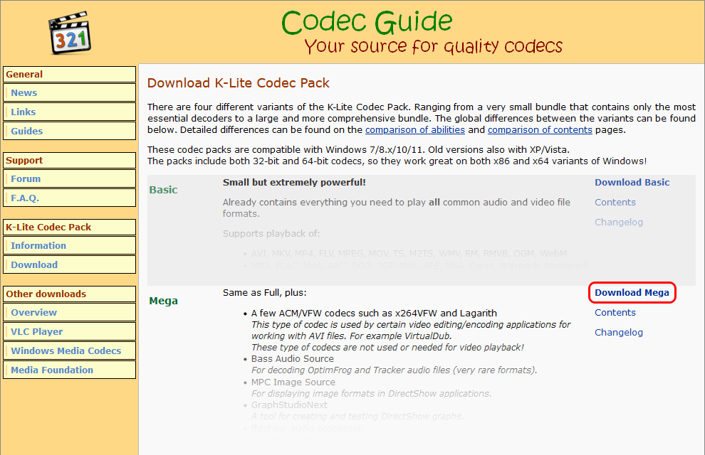 Téléchargez la dernière version du K-Lite Mega Codec Pack sur codecguide.com