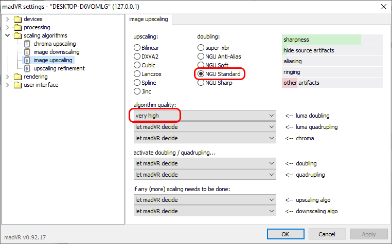 Chez moi j'ai une config dont la carte graphique est suffisamment puissance pour utiliser les hautes valeurs de NGU Sharp mais le problème après c'est que les ventilateurs de la carte graphique font un peu trop de bruit après... Du coup il a fallut que je trouve un bon compromis au niveau des nuisances sonores en rebasculant sur les anciens filtres d'upscaling les plus classiques qui sont moins gourmands en ressources. Les barres de graphiques dans le coin en haut à droite servent à t'indiquer quel sera l'effet prévisible du filtre sur l'image. Tu peux manipuler ça un peu et voir les filtres qui t'intéressent. Personnellement sur ma config qui faisait trop de bruit j'ai mis Lanczos à la place de NGU Sharp et j'ai activé le filtre Anti-Ringing ça donne des résultats qui sont presque aussi bons que l'uspcaling par NGU pour nettement moins de consommation de ressources ce qui ménage la vitesse des ventilos de ma config, j'ai trouvé ce compromis. MadVR est un outil très puissant mais il faut adapter les réglages selon les capacités de sa config.