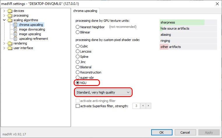 Là c'est un menu très important cette fois-ci. On va régler le filtre d'upscaling général et pas uniquement celui du chroma comme tout à l'heure. Comme pour le chroma je vous propose là aussi de sélectionner le NGU Standard, avec le preset very high pour avoir une qualité au top. Pour ceux qui sont amoureux du piqué d'image, qui aiment les images vraiment sharp, vous pouvez éventuellement utiliser le NGU Sharp qui sera justement taillé pour vous.