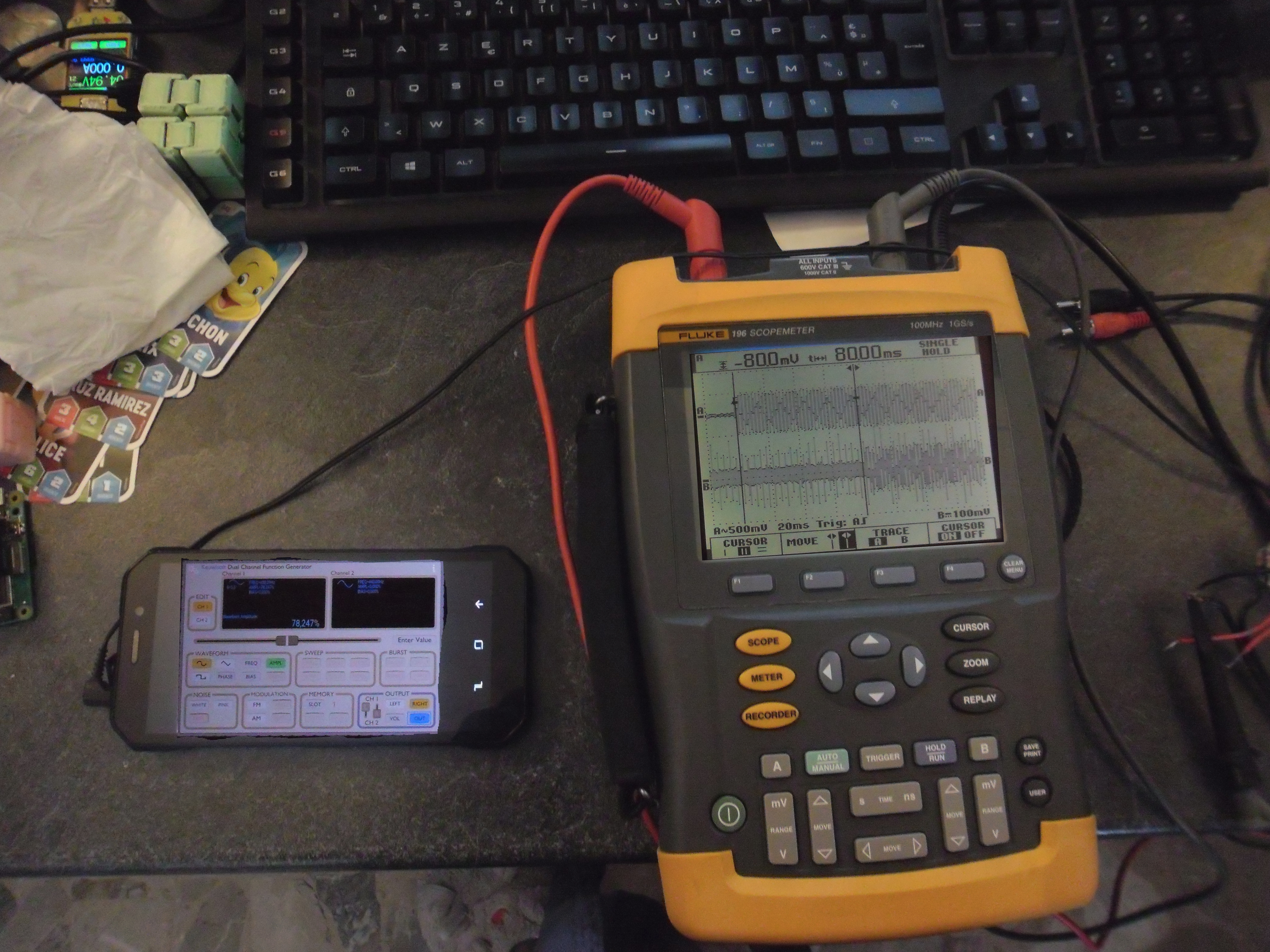Oscilloscope branché sur le signal d'entrée (generateur de fonction sur le smartphone sunusoide 400hz)