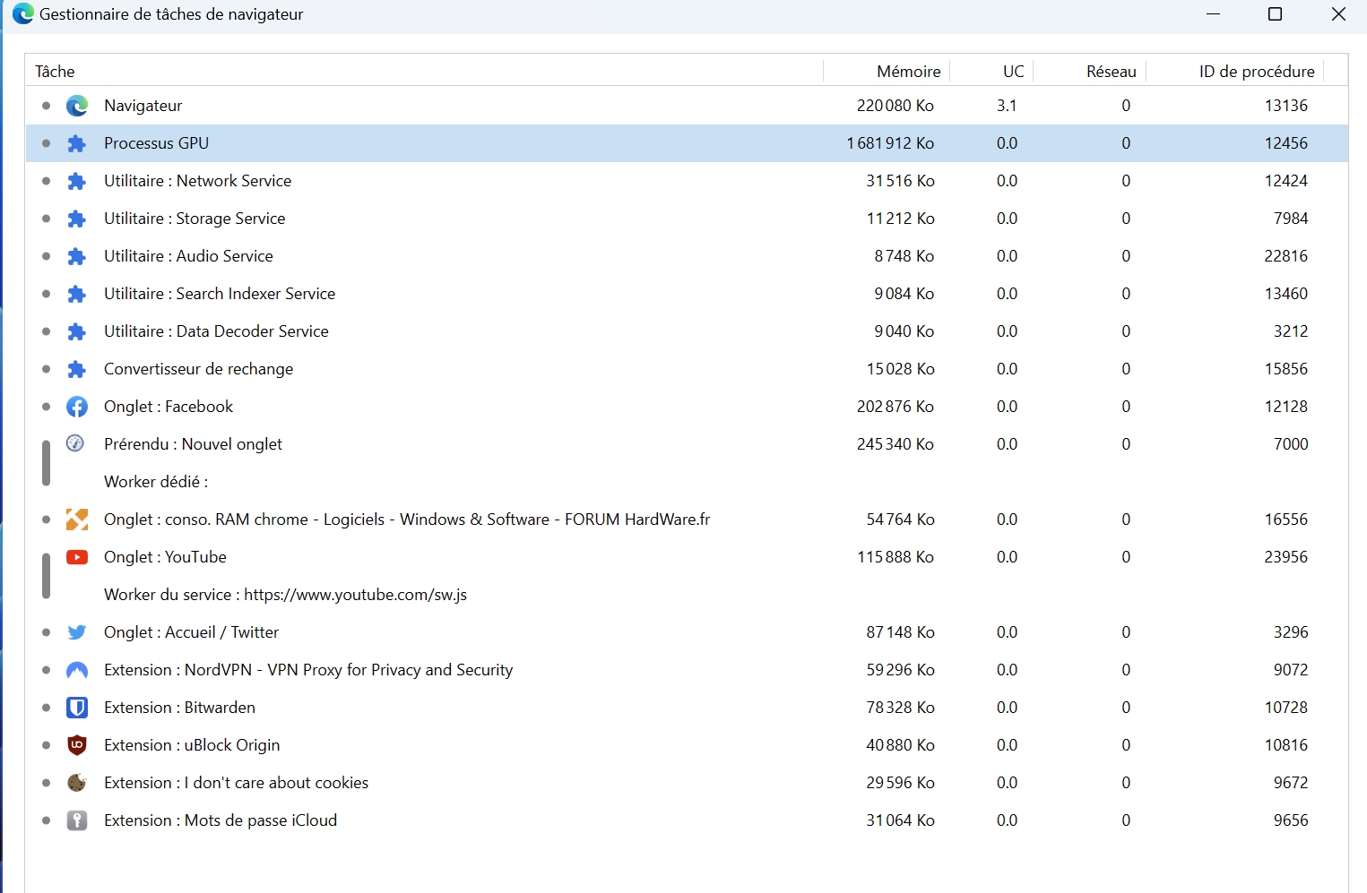| Z_cool a écrit : je suppose que c'est pareil sous Chome, avec Edge, il y a un gestionnaire de taches rien que pour lui, on peut voir la RAM utilisé en detail : |