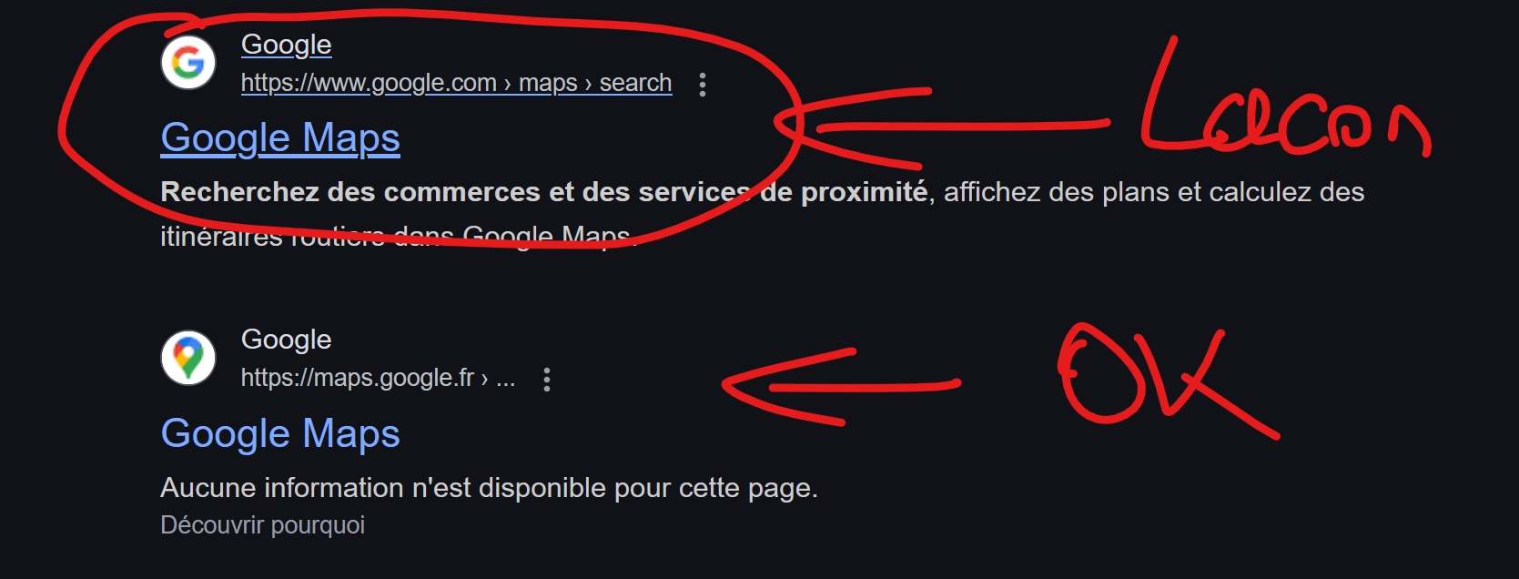 | toshopp a écrit : J'ai fait le test sur PC boulot et smartphone perso via la web apps (mode privé pour qu'il n'ouvre pas l'apps GMaps), quand je recherche Google Maps dans Google et que je clique sur le premier lien dans Google il m'emmène aussi à Lacon. Test fait avec 2 collègues du boulot, même comportement. |
