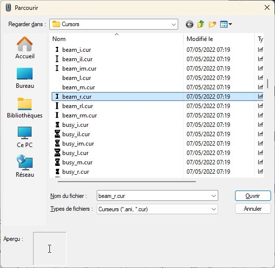 La dedans tu cherche "beam_r.cur", tu clique sur "ouvrir" puis sur "appliquer", puis sur "ok".