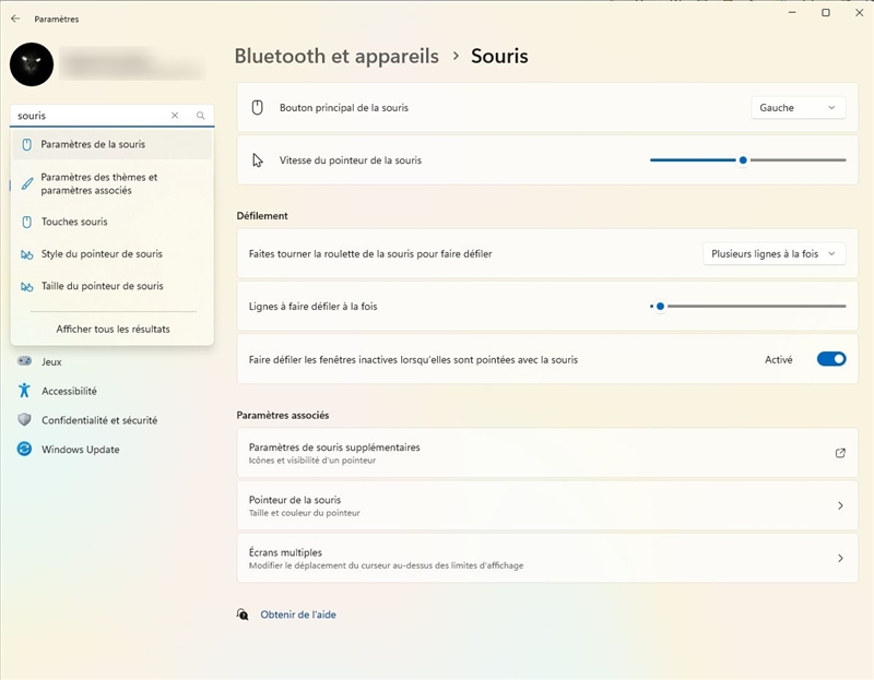 Tu ouvre les paramètres, dans la barre de recherche tu tape "souris" et tu sélectionne "Paramètres de la souris", tu va tomber sur cet écran.