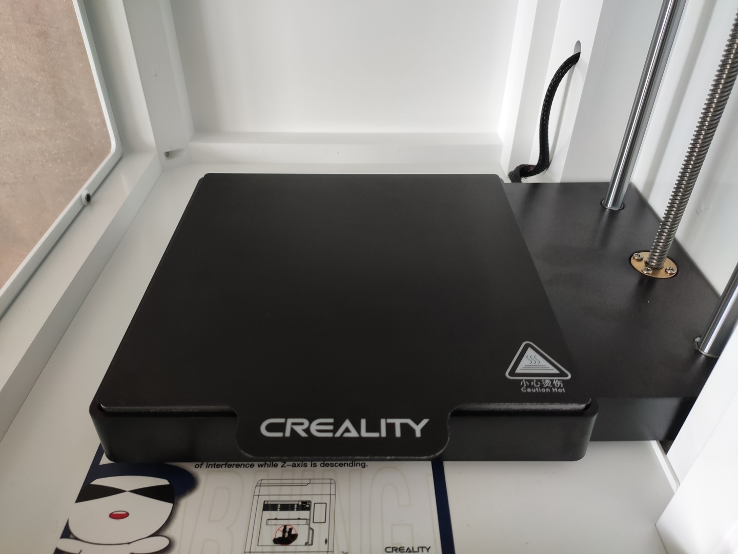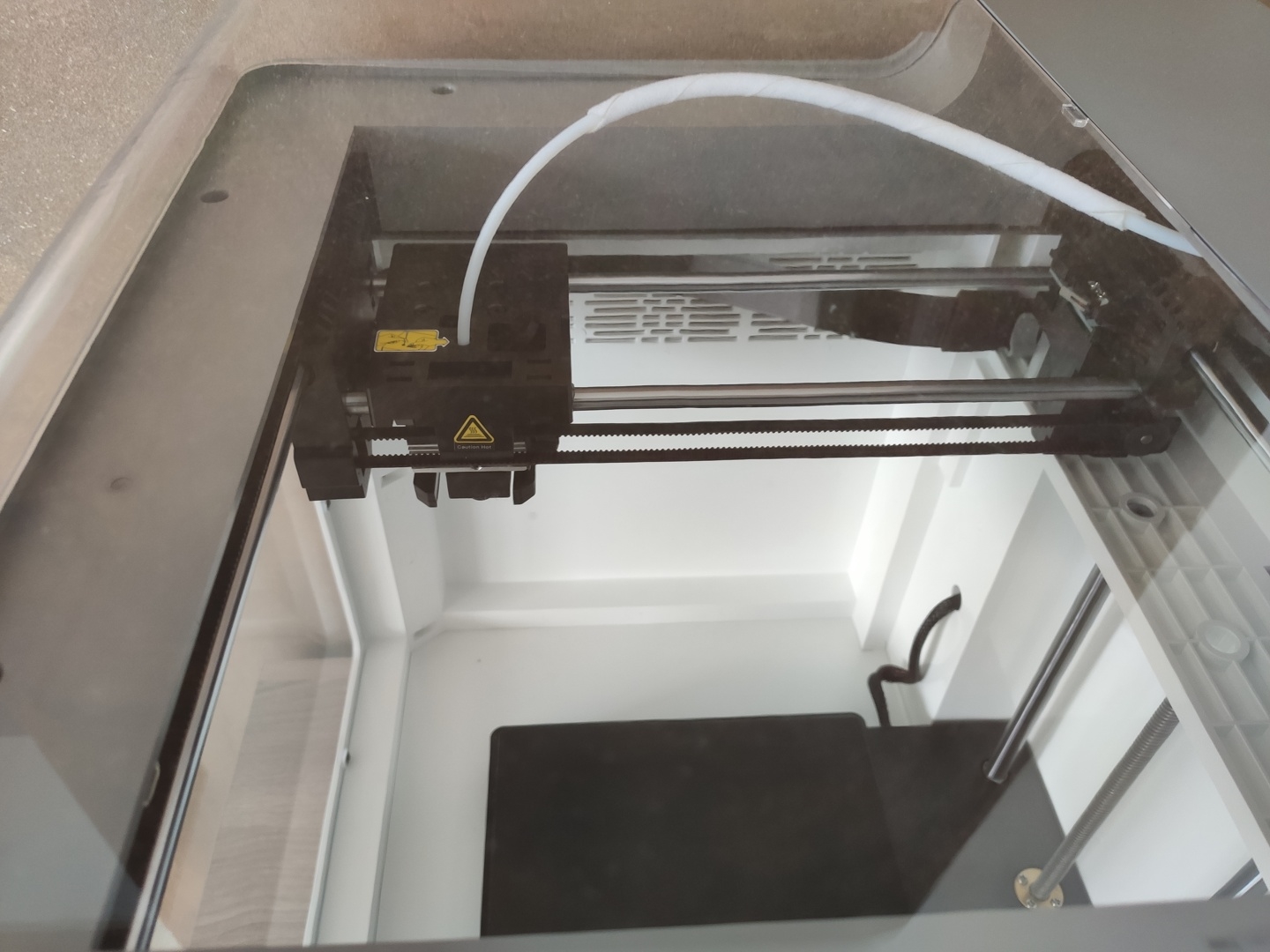 A l’intérieur, on y trouve donc un plateau magnétique sur lequel est (fortement) aimanté un support flexible, une extrudeuse à démontage rapide et une gaîne pour le passage du filament. L’imprimante supporte le Wifi et peut-être pilotée et mise à jour via l’application Creality Cloud. La qualité de fabrication et d’assemblage semblent très correcte compte tenu du tarif, même si évidemment on sera toujours loin d’un modèle haut de gamme. Ça reste néanmoins une machine correcte équipée d'une extrudeuse direct drive avec tube de guidage et une cinématique cartésienne où le bed ne se balance pas sur l'axe X, c'est assez peu courant dans cette gamme de prix et surtout pour un modèle prêt à l'emploi sans aucun assemblage requis.