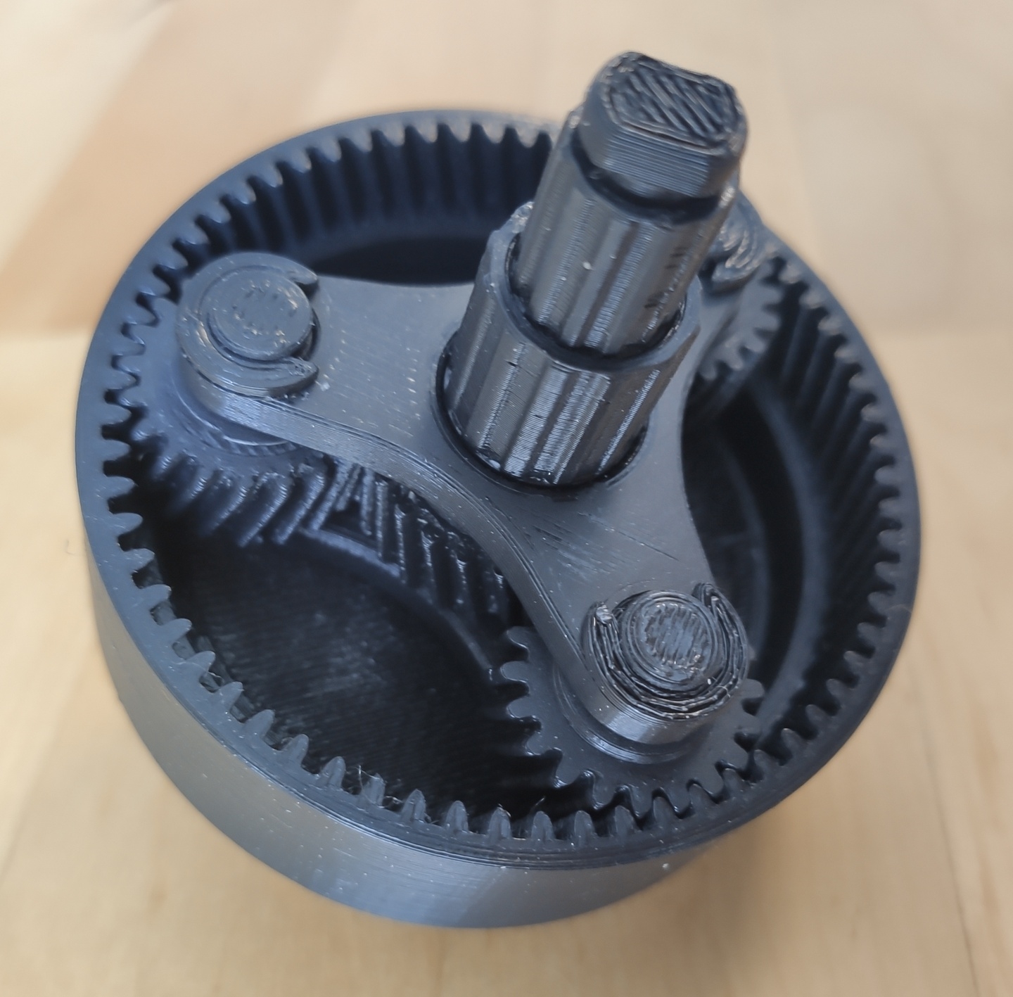 En plusieurs pièces : satellites, pignon solaire, porte satellites en deux pièces, couronne et clips/rondelles imprimés séparément.