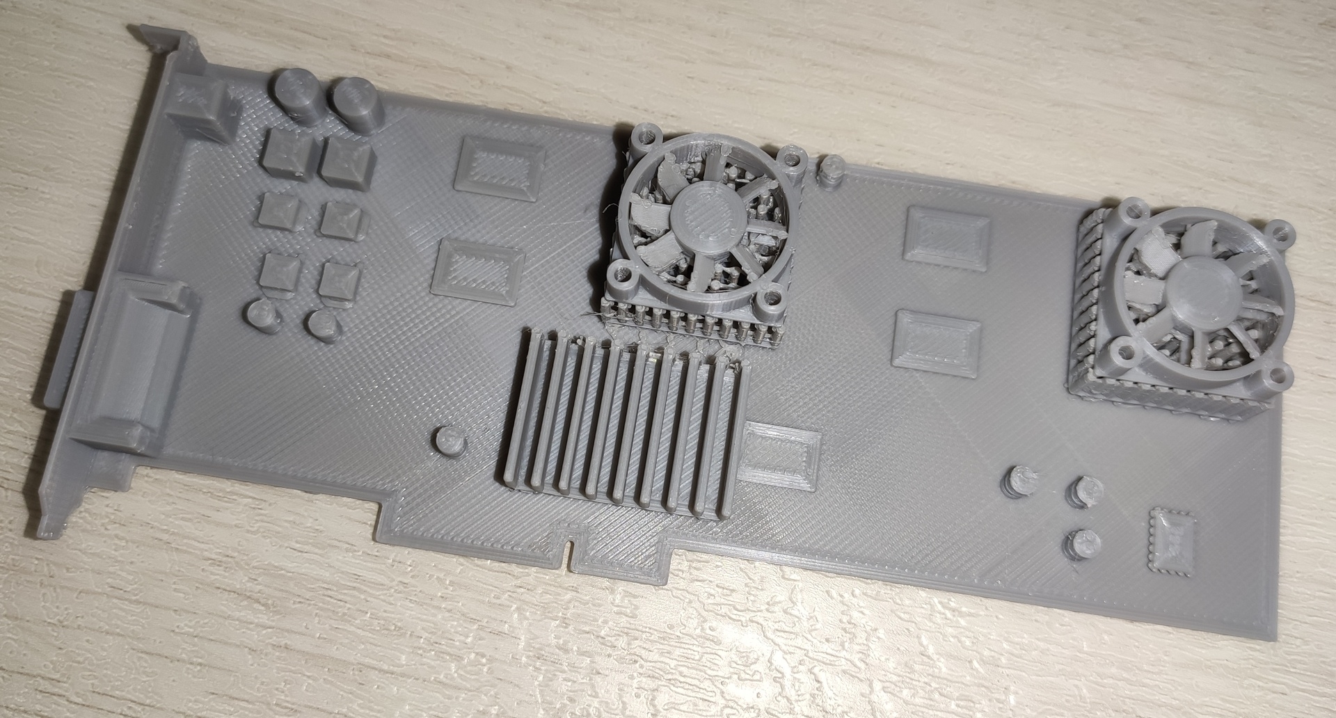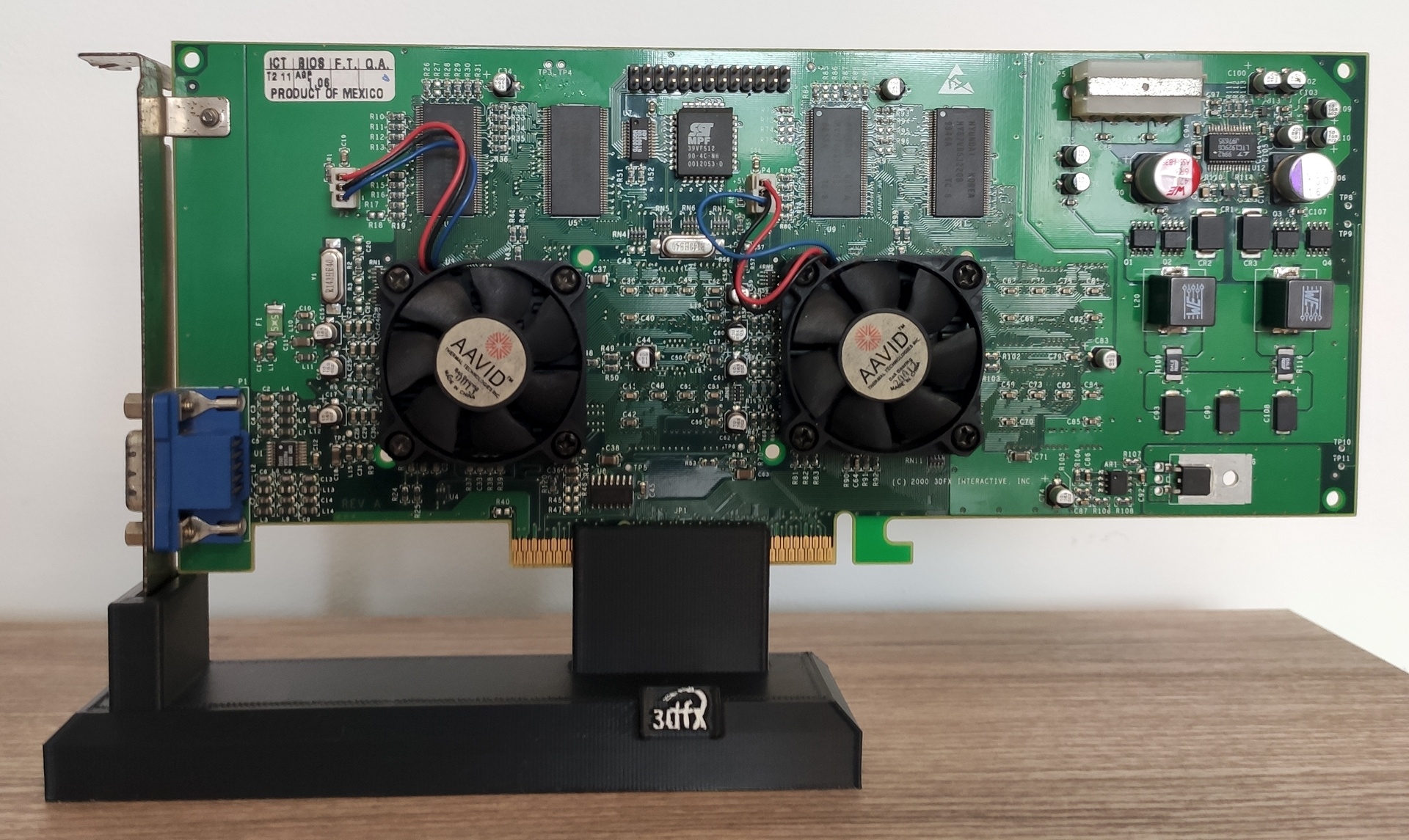 Un support pour exposer ses cartes (ici une Voodoo5 5500 AGP réparée), imprimé en PLA+ Creality couches de 0.2, infill à 10%, deux inserts en TPU 95A au niveau du "slot" et du maintien de l'équerre.