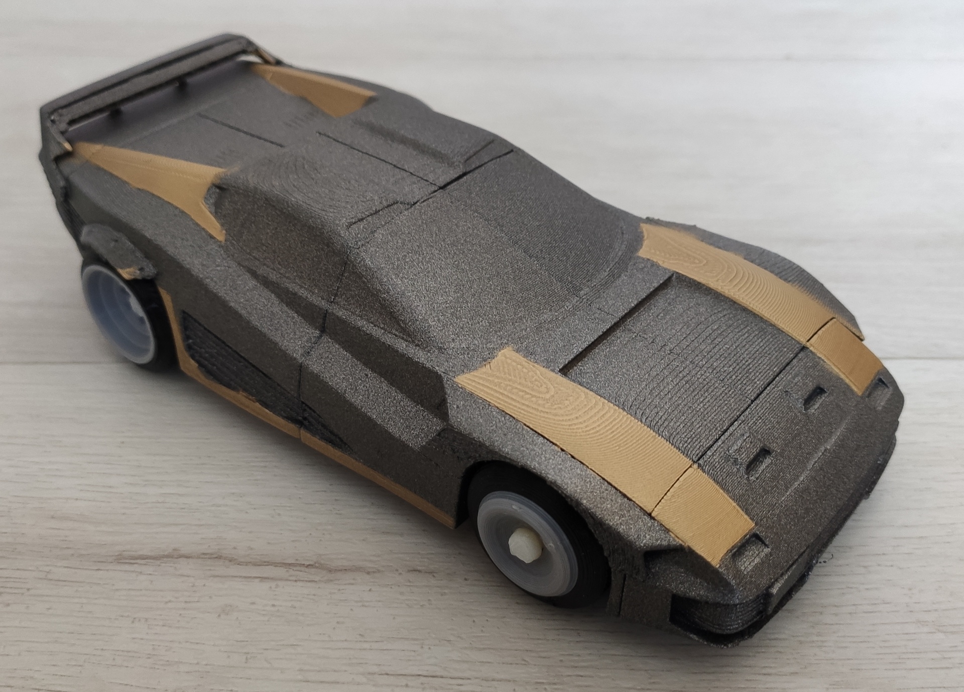 ), les jantes sont en PLA, les pneus en TPU 95A et les axes de roues (faits sur mesure, ceux du modèle d'origine ne sont pas fait pour tourner) en ABS.