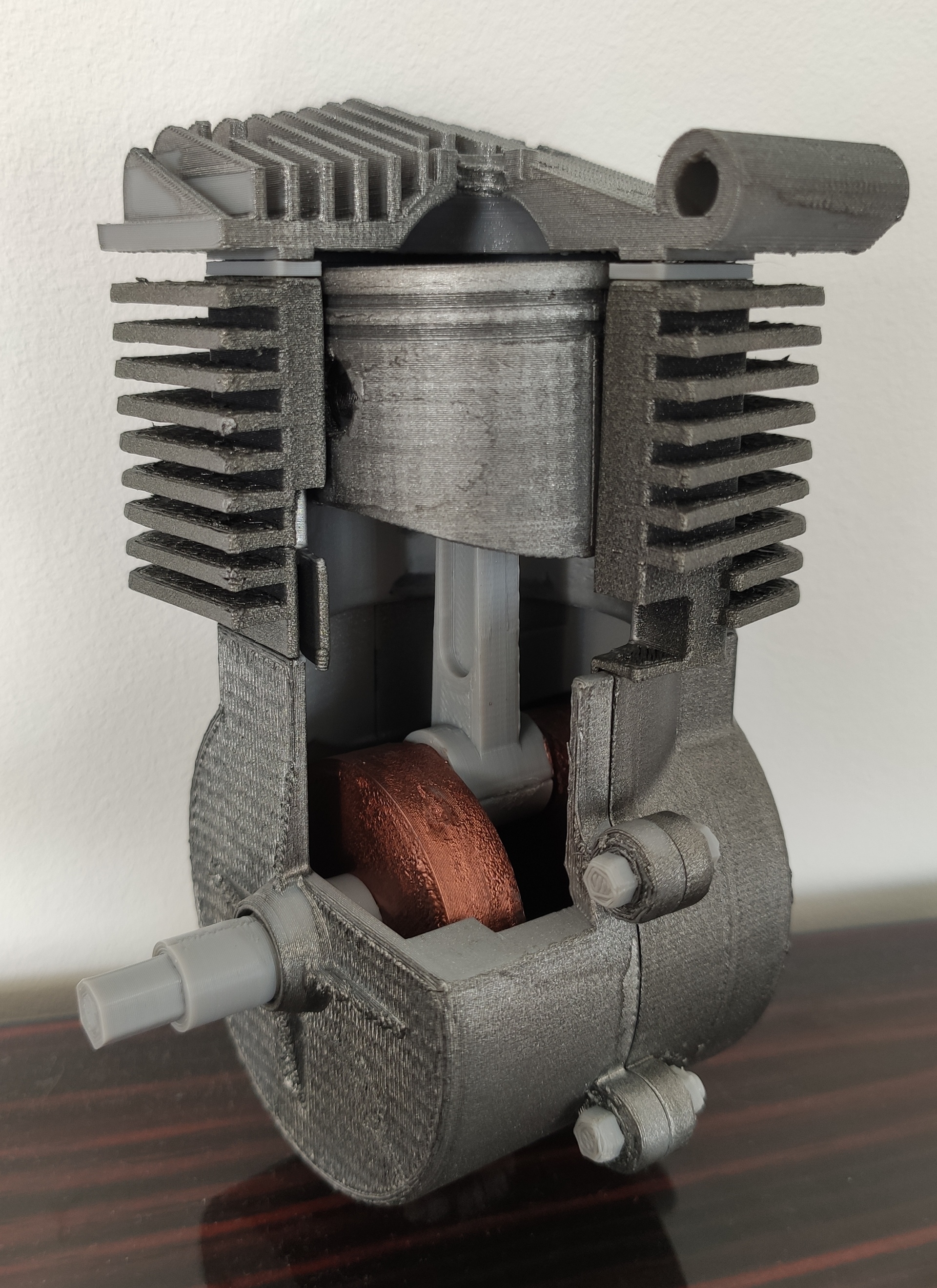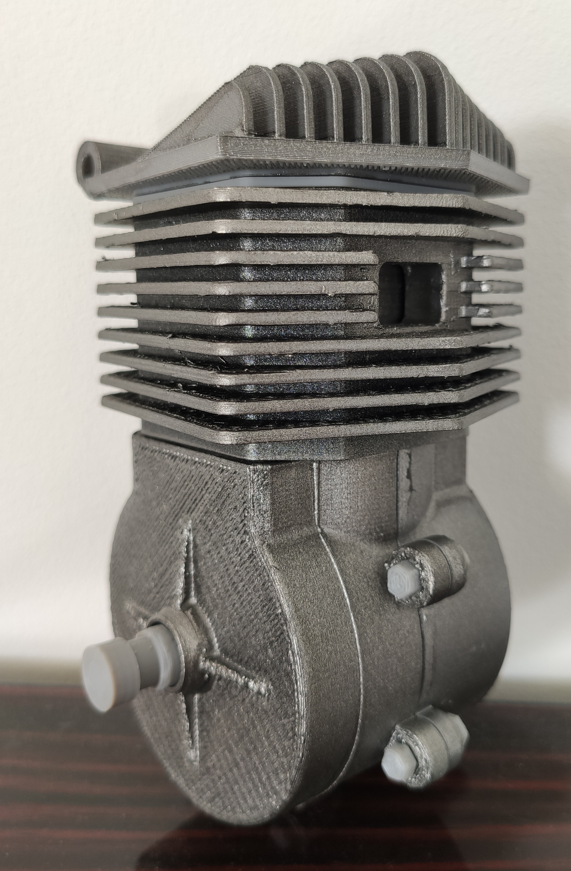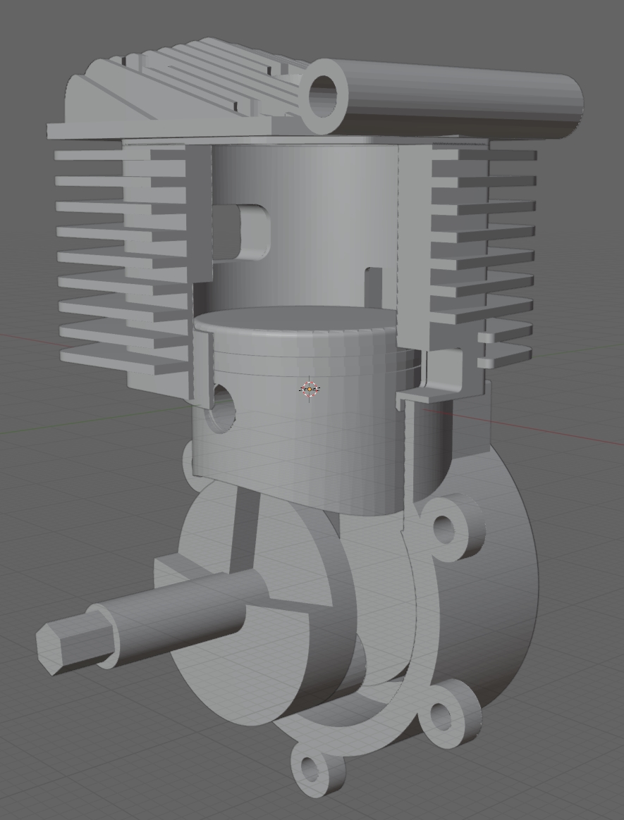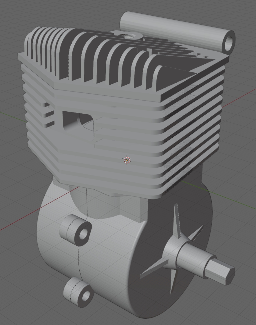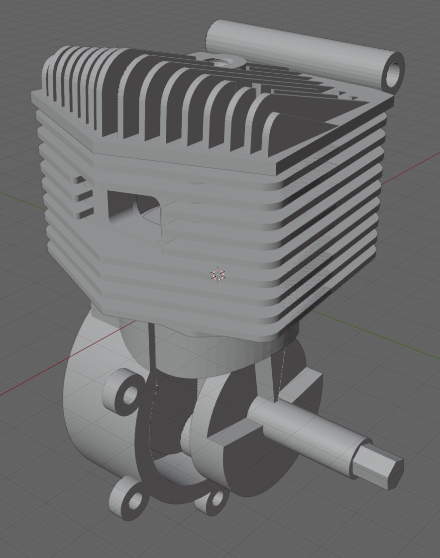 Du coup, je voulais un print d'un moteur 2 Temps mais je n'ai rien trouvé qui corresponde à mes attentes, du coup j'ai fait chauffer FreeCAD et Blender, je suis content, j'ai encore quelques restes :