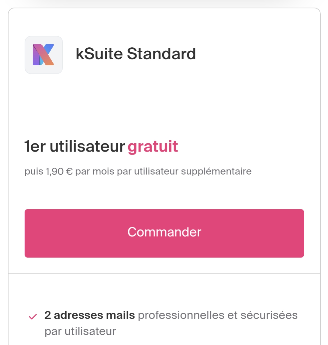 J'ai lu des choses très positives sur Infomaniak, mais ne suit pas sur d'avoir compris toutes les nuances de leur offre produit, ce serait l'offre KSuite Standard qu'il faudrait, gratuit et y ajouter le pack "service mail" pour 5 adresses à 1.50 €/mois ?